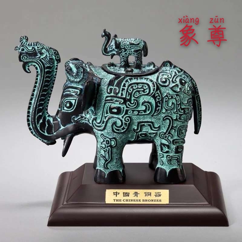 象尊,传世品,一级文物。象鼻作流,弓卷上举,鼻端前后分叉。前叉呈凹槽,后叉呈坡型。象牙伸出随鼻弯曲。两耳竖起,微向前倾。双目侧凸注视前方。整个器体厚重浑圆,四肢稳定如柱,造型笨拙憨美,为中国古代青铜器之珍品。象为吉祥之物,为收藏之佳品。原物现藏于湖南省博物馆,此件为复制品。