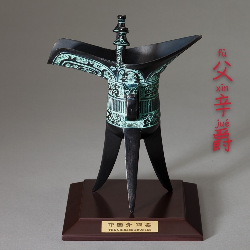 父辛爵,原物高22.3厘米,长17.5厘米。1976年出土于陕西省扶风县庄白一号窖藏,一级文物。长流,尖尾,束颈,腹微鼓,圜底,三锥形足。口流交接处有两立柱,菌形柱头,上饰涡纹。腹部为云雷地饕餮纹,柱至器面有铭文。爵为吉祥之物,有加官进爵、蒸蒸日上之意。
